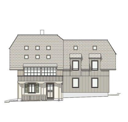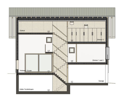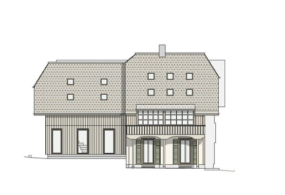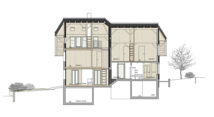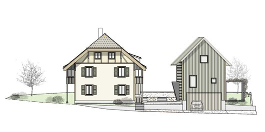 Zwei bestehende Hausteile werden saniert und vereinen zusammen Geschichte, Architektur und Holzbau. Erweitert wird die Anlage mit einem kompakten Neubau, der über Halbgeschosse zentral